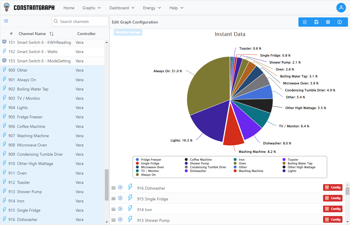The energy disaggregation feature within ConstantGraph will create new data channels for each of the detected devices which can then be graphed using the various charting features: